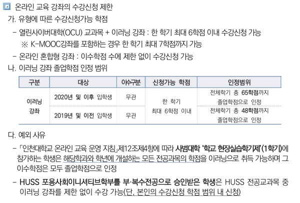 온라인 강좌 증가, 융복합 교육 확대 등의 사유로 「인천대학교 온라인 교육 운영 지침」 제12조(이러닝 강좌 학점 취득) 개정에 따라