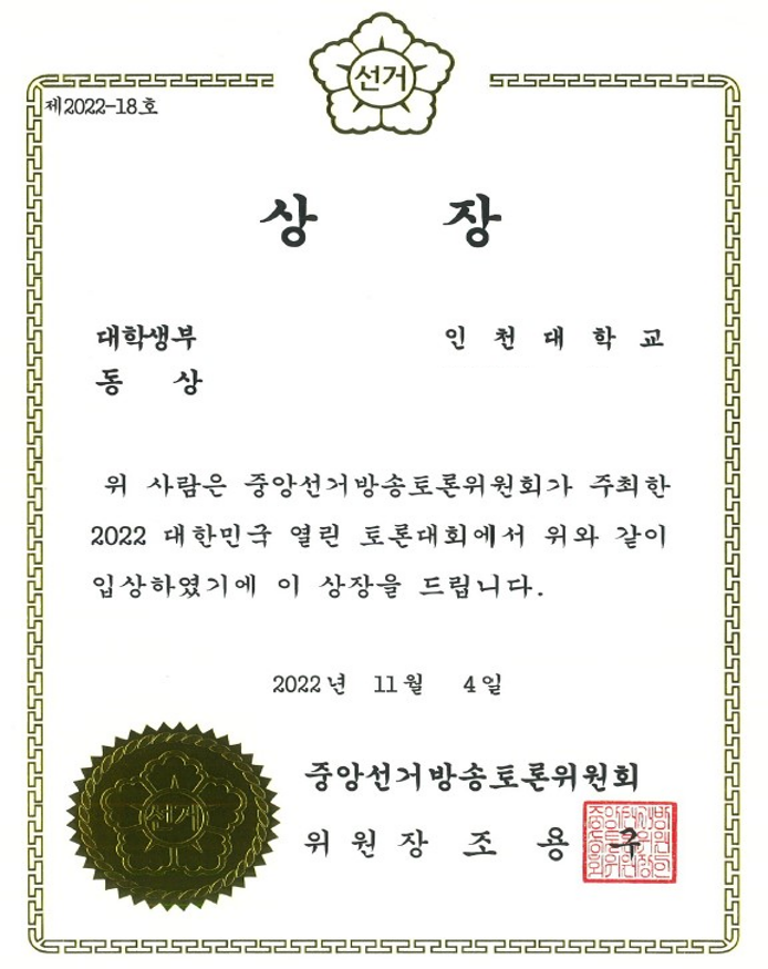 2022년도 성과 2022 대한민국 열린 토론대회 동상 수상 연합뉴스TV 캠퍼스 TV 리포트 출연 2021년도 성과 2021 전국대학생 스피치대회 최우수상 수상 연합뉴스TV 바로 보는 TV 옴부즈맨 대학생 리포트 활동